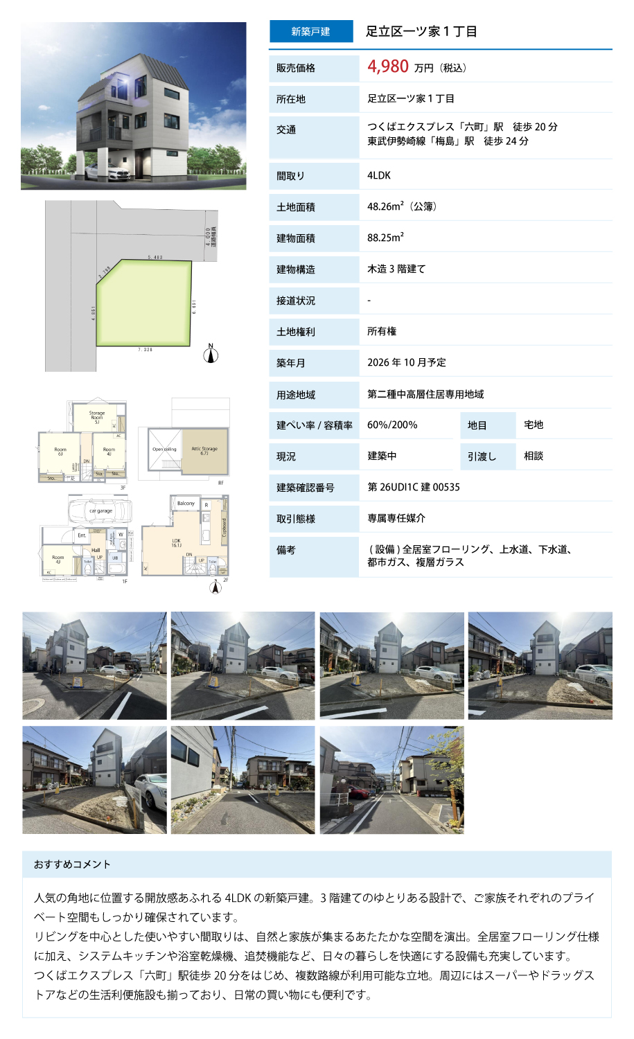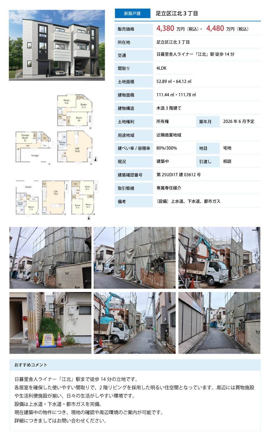 日暮里舎人ライナー「江北」駅まで徒歩14分の立地です。各居室を確保した使いやすい間取りで、2階リビングを採用した明るい住空間となっています。周辺には買物施設や生活利便施設が揃い、日々の生活がしやすい環境です。